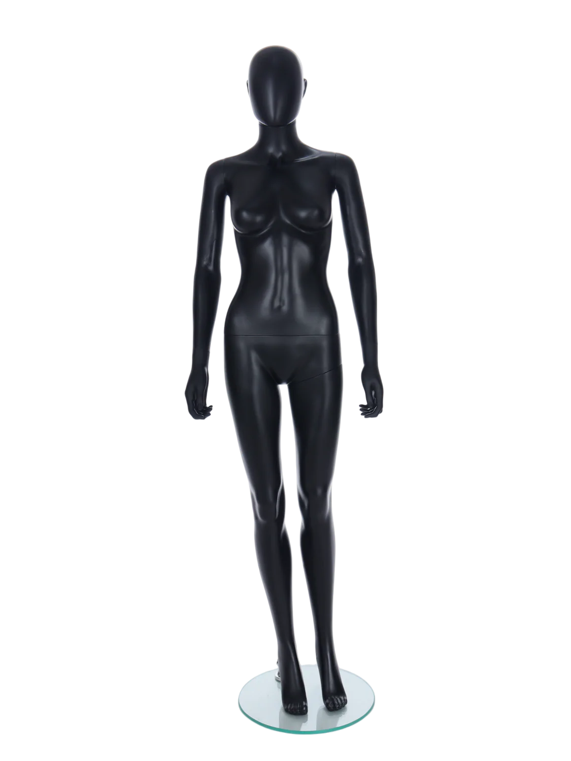 This black-finished female mannequin offers a versatile display solution with its full-bodied design, adjustable head, and arms for various poses. Constructed from durable plastic, it withstands wear while remaining lightweight for easy handling. The mannequin includes a toughened glass base and a calf and foot kit, accommodating sock and shoe displays. Its egg-shaped head with ears adds subtle detail, making it well-suited for showcasing clothing, accessories, and jewellery with professionalism and style.