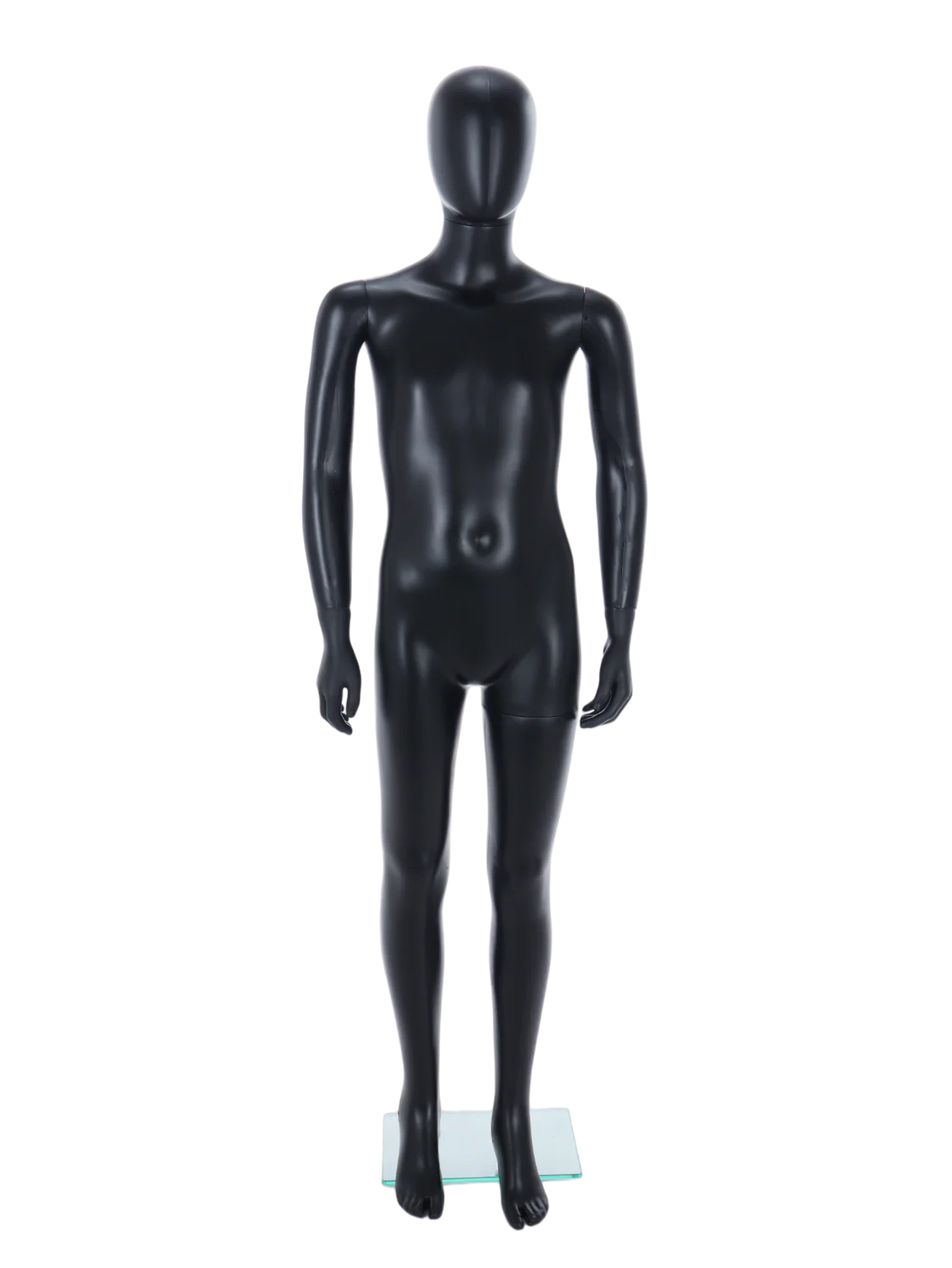 This unisex child mannequin features a full-bodied design with a smooth matt black finish and a minimalist egg-shaped head, suitable for showcasing a broad range of children’s clothing and accessories. Made from durable, virtually unbreakable plastic, it ensures resilience and longevity. The mannequin includes an 8mm thick toughened glass base for stability, plus a calf and foot kit to accommodate socks and shoes. Adjustable head and arms allow for multiple poses, while its lightweight construction supports easy handling and transport, making it ideal for professional retail displays.