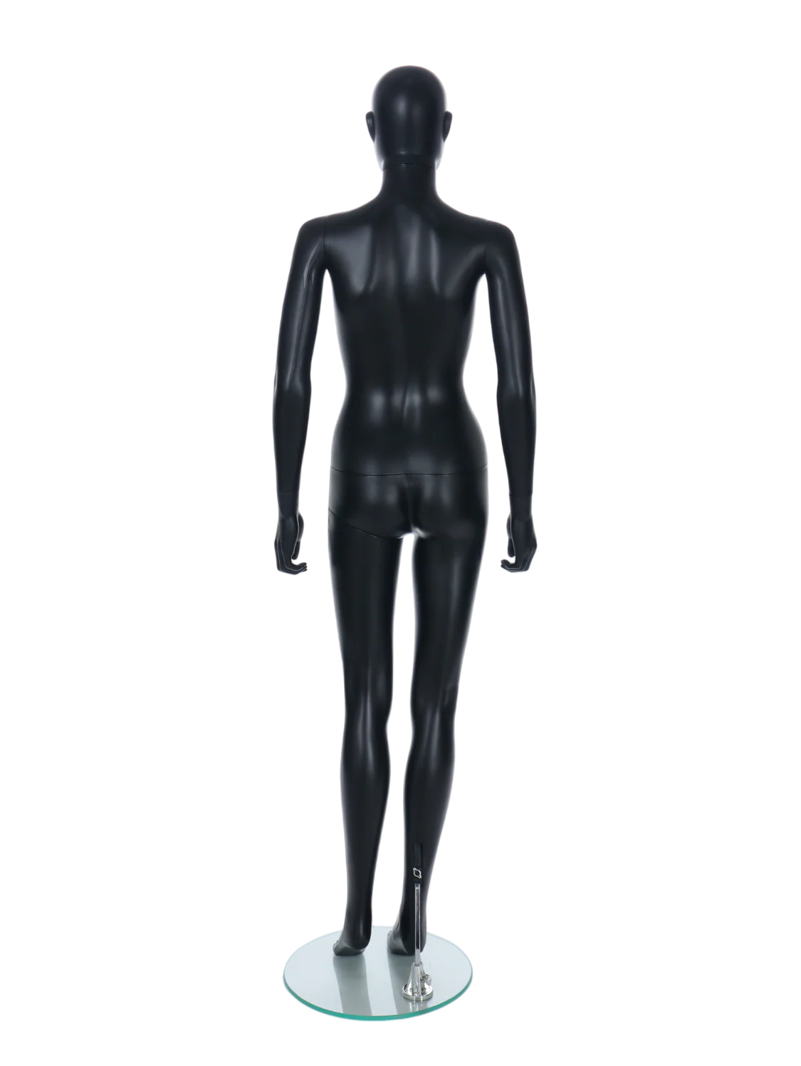 This black-finished female mannequin offers a versatile display solution with its full-bodied design, adjustable head, and arms for various poses. Constructed from durable plastic, it withstands wear while remaining lightweight for easy handling. The mannequin includes a toughened glass base and a calf and foot kit, accommodating sock and shoe displays. Its egg-shaped head with ears adds subtle detail, making it well-suited for showcasing clothing, accessories, and jewellery with professionalism and style.